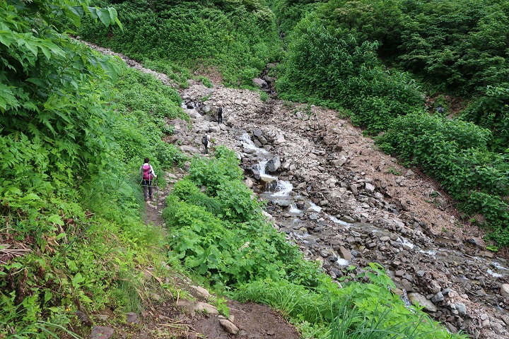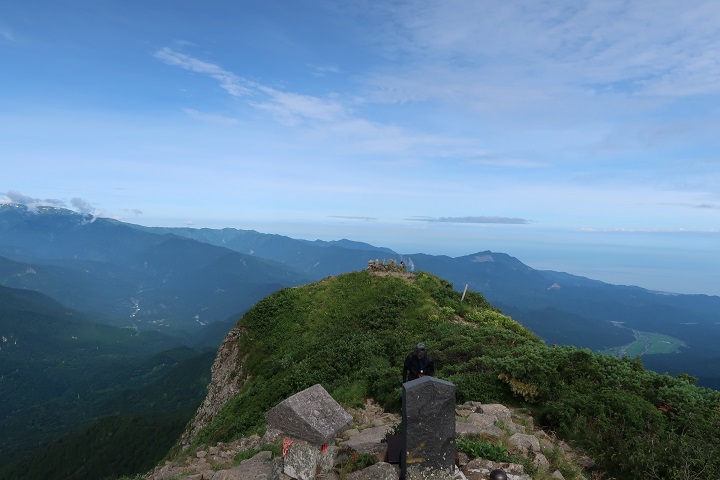 | 2024年7月27日 【上信越:雨飾山】 山の動画を見ていて、登りたくなった山が雨飾山。山頂からの展望が良いので晴れていればラッキー。でも雨も多いので危険でもある。 そして犬が大丈夫かどうか心配だったけれど、キャンプ場では犬同伴OKだったので、一安心し、前日にキャンプ場に泊まり、翌日雨飾山へ登る計画にしました。 この暑さと雨が心配でしたが、すでに休みをとったので、行く以外はなく、出発しました。 でもその週に雷雨による停電が2回も発生したので、家に残す猫のことを思い出し、停電時のエアコン復旧依頼を隣の方にお願いしました。そうでなければ猫といえども熱中症になる暑さです。 そこをクリアし、出発。 家からとても遠いことが問題。だから前日に入らないと登れない山でした。 本当なら当日に登り、その日に泊まってから翌日帰るのが理想ですが、そうも言っていらない。 なんせ日本海間近。高速道路を下りてからがまた長い道。そして山の中。たどり着くのか心配になる。 山の中にある温泉にも入りたいけれど、犬がいるので×。車で待たせるのは危ないので断念します。でも古くからある温泉旅館が2軒あるのだからすごい。それなりに人が利用しているようでした。 キャンプ場では当然テント泊。夜には、テント入り口のファスナーが空いていて、蚊がどんどん入ってきてしまい、大変なことになってしまいました。あまりにブ〜ンとうるさいので、起きてみると10匹くらいテント内に入ってきていたので、殺すことになりました。おかげでそのあとはちゃんと眠れました。 前日は8時には眠っていたので、3時30分ころには目が覚め、出発準備開始。5時13分出発しました。始めは、湿地帯の木道を歩きます。人の背丈以上もある巨大な草の中を歩いていると迷路に迷い込んだよう。ガクアジサイがいっぱい咲いていました。 登山口 湿原地帯 ガクアジサイ そこを抜けると登りが始まります。はじめは緩い登りもそのうち急な登りになりました。30分くらい歩くとブナ平につきます。そこはりっぱなブナの木がたくさん育っている森の中。上を見るとブナの葉の緑がとてもきれいでした。お花もちらほら現われて、登ることが楽しくなります。 木の根の階段 ブナ平 ブナの森 登りを頑張っているといったん平らな道になり、トイレブースが現われました。その先は下りになり、雨飾山山頂近くの一枚岩:布団菱が見えてきて、やる気が出ます。そして荒菅沢に出ました。 沢に出ると風がとても涼しくて気持ちがよかった。沢の水がとっても冷たくておいしい。はるちゃんも飲んでいました。 急な登り 携帯トイレブース 布団菱 荒菅沢が見えた 一息ついたら、ここからが本腰を入れて登りが始まる。がんばるー‼ 岩の段差が大きな登りがきつくなり、はるちゃんも大変ですが、がんばっています。早朝出発して歩いていましたが、暑くて大変。でもなんとか登っていました。そして森林限界超えて、見晴らしも良く、お花が増えていき、楽しさ倍増します。 段差が大きくなる 急登 見晴らし 稜線 はしご 振り返ると 今回は暑いけれど、登りが辛いとこいうことはなく、たんたんと登れていました。上へ行けばいくほど、お花がたくさん咲いていて、驚きの連続。こんなところ初めてー!そんなこんなで気がつけば、笹平へ到着。もうすでに一面のお花畑世界。 きゃー!!!!!!!!!!! 登りもあと少し お花たち@ お花たちA 京鹿の子(シモツケソウ) ギボウシ 笹平 そして日本海が見える。笹原を通ったあとは最後の登り。でも今日は疲れ知らず。 このすばらしいお花畑に感激し、疲れを感じない。最後の登りも息を整えながら登って、 10時43分山頂到着。最高の景色とお花たち。なんて素敵な世界なんだぁーとうれしさ爆発。 雨飾山山頂 白馬岳と朝日岳 日本海 あまりのきれいさに私としてはめずらしく、しばらく滞在しました。山の上だからこその花一面の世界。いろいろな花が一斉に咲いていて、おどろくほどの美しさ。写真を撮ってから、リンゴを食べて休憩し、その後また写真を撮る。下山することを忘れるほど、楽しい時間でした。 でも帰らなければならないので、しっかりと記憶に残し、下山開始します。太陽も出てきて暑い。 はるちゃんが大丈夫か?さすがに暑さで歩かなくなり、抱っこになりましたが、荒菅沢の沢に浸り、熱を下げてからは、森の中なので、歩いてもらいました。いつもの元気はるちゃんに戻り、すっ飛んでいきました。 こんなにお花が咲いていると思わず、本当に驚きました。ここに登りに来てよかった。 こんなことがあるから、山登りは楽しい。自然って本当に素敵だと思いました。 |