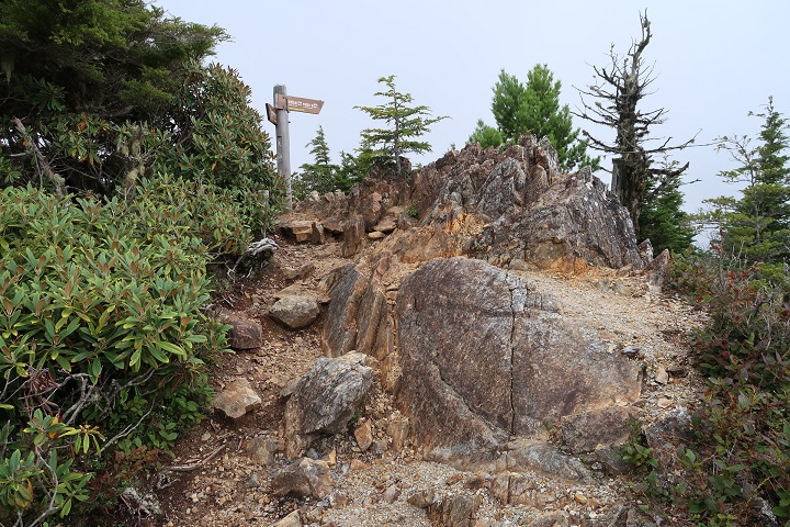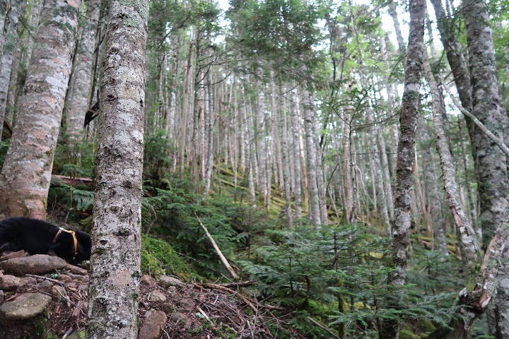 | 2024年8月23日 【奥秩父:甲武信ヶ岳】 昨年も登った甲武信ヶ岳へ登りました。 せっかくテント泊をしようと思っていたけれど、この夏の雷雨で奥秩父の山は雨と雷と日中はガスで真っ白らしく、テント泊どころではないとのことで、断念しました。それでも日帰りで行けそうなので、登ることしました。 車で走っていると大月付近から雨が降り始め、勝沼を過ぎたあたりで雨が激しくなり心配しましたが、そこを抜けるとまた雨がやみました。 無事に長野県の毛木平駐車場に着くと、泊まっている車は6〜7台しかなく、この雨の影響なのかなと思いました。 天気は曇りだけど雨が降り始めたら下山するつもりで、7時30分ころ出発しました。 そんな状況でしたが歩き始めると、太陽も差し始め、きれいな森を見ることができました。ときどき暗い森になるのですが、この森は本当にきれいです。 マルバダケブキの道 登りはじめ キラキラの森@ A しかも今日は荷物も軽くてサクサク歩けます。緩く登っていく道だけど、それなにり登りがあったり、岩場があったりするので楽しい道です。苔の森を歩くだけでも楽しいと思います。そして1時間ほどでナメ滝に着き、その先へどんどん進むと、一度左岸へ渡ります。奥に進むと上空は雲で太陽の日差しがなくなりました。少し暗い森になりますが、あと少しなので頑張ります。そこをしばらく歩くと9時55分に千曲川源流に着きました。 ナメ滝 左岸の道 源流の碑 急な登り 前回に湧水付近は見たので、スルーして急登に入ります。はるちゃんは軽々登っていきますが、私は大変。荷物があったらもっと大変なのに、息が苦しい。けっこうな急登ですが、息を整えながらなんとか稜線にでました。それでもまだ登りがあるので、辛い。なんだか今日は苦しいですが、あと少しのなので先へ進みます。 山梨側から雲がどんどん出てきて、何も見えない真っ白。それでも山頂直下では青空も見えました。10時34分到着!毛木平方面は見えたり見えなかったり。そして今日は十文字峠から下りようと思っていたので、三宝山方面も確認しましたが、雲で見えたり見えなかったり。でも雨は降らなさそうなので、はるとリンゴを食べたあと、十文字峠へ向けて出発しました。 山頂の様子 これから向かう方角 歩き始めるとだんだん薄暗くなり、暗い森の中へ入っていく感じで、こっちにいかなければよかった…と思いましたが、もう歩き始めてしまったので、そのまま行くことにしました。三宝山までは、いったん下ったあと、また登ります。 三宝山山頂 これから下る ここまでは以前に来たことがあるのでいいのですが、そこから先がまた誰もいない。ガスで何も見えず、気分は暗くなり、クマでも出てきそうで、ゆっくり立ち止まっていられない感じでした。これはもうどんどん歩くしかないので、かなりの速さでどんどん下ります。まだ下るのかと思うほど下ったところで、大きな桃のような形の岩が出てきたので、地図に載っていたポイントだとわかりました。ようやくホッとし、武信白岩山が近いことがわかりました。ちゃんと地図どおりに先に進んでいたことがわかったので、水飲み休憩。ここから登りなので、ゆっくり歩きました。かなり下ったので登りはどうなんだろうかと思いましたが、思ったほど登りもなく、岩場が出てきて案外楽しめました。 道を振り返る 大きな尻岩 武信白岩山が岩の山のため、一帯は岩稜帯の道になっていて、大きな岩を下り始めたときに、はじめて人に出会いました。登りの時に歩荷さんから聞いた人たちだとわかりました。私がここまで下ってきていてようやく出会ったので、十文字峠から来るとかなりの時間がかかるんだなとわかりました。 岩場の道 お花が咲いている 少し先へ行くと梯子が出てきたので、大山が近いなとわかりました。 この岩の上にでると「お〜眺めがいい」。下り始めは怖いくらいでしたが、ここまで来ると結構面白く、岩場好きには持ってこちのおすすめ登山道です。見晴らしはとても良さそう。でも急いでいたので、よく見なかった。ここまでは間違っていないので、あとは十文字峠へ急いぎます。(遠まわりしているので時間がない) 大山山頂の鋭角に曲がる道 大山からの下り あとは下るだけ。どんどん歩きますが、小屋はまだ見えない。30分くらいは下っただろうかというところで、ようやく小屋らしき屋根が見え、栃本への分岐があり、小屋に到着しました。誰かいるかな〜と入口まで行きましたが、歩荷のため留守でした。キノコうどんがおいしそう。 十文字小屋 ようやく安心し、残りのリンゴをはると食べてから下山。あと少しだから気を付けております。 下り始めると人が登ってきて、挨拶をすると小屋のお父さんでした。歩荷で大変そうでしたが、はるちゃんを褒めてくれました。ほとんど人に会わなかったので誰かと話せるとうれしいです。 お腹もすいてきたけれど、あと少しなので駐車場まで頑張りました。 こ