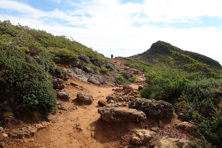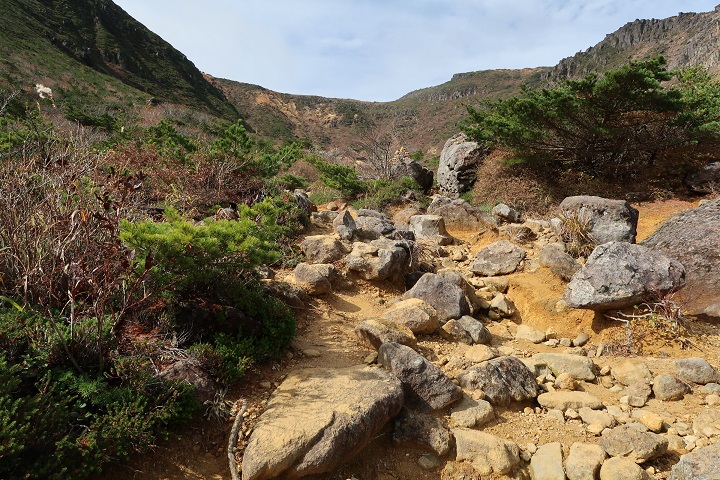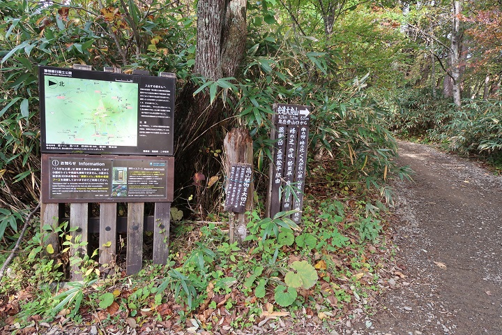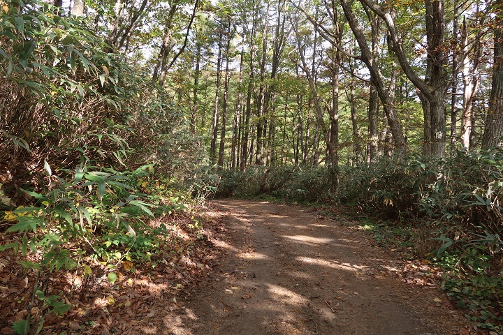 | 2024年10月24日 【磐梯・吾妻:安達太良山】 行ってみたかった山の中の一つの安達太良山。遠くてなかなか行くことができずにいたけれど、寒くなる前に行こうと決め、計画しました。 登山コースは日帰りハイキングだけれど、下山後はどこかに泊まる必要があるので、犬連れOKのキャンプ場【前が岳キャンプ場】を探して、泊まることにしました。 当日は3時に起床し、準備をして4時を過ぎてしまったけれど、20分頃には出発でき、福島県二本松市まで車の運転をしました。以前の磐梯山のとき、あまりの遠さに「いつつくのだろう…」と不安になったことがありましたが、今回はなんとか4時間で着くことができました。 8時を過ぎ、奥岳登山口から登る予定の駐車場はすでたくさん車が止まっていました。平日でも次から次へと車が到着する人気の山でした。 8時30分、愛犬はるくんと登山開始。99%皆さんはロープウェイ駅を目指し、登山口から歩くのは私たちだけでした。しかも登山口がよくわからず、うろうろしてしまい、時間ロス。今日は昼食を外食し、温泉に入ろうと思っていたので、けっこう急いで登りたい。でも落ち着いてみればすぐ先にありました。 一番奥にある登山口 林道 工事をしていて、車も通っていましたが、歩いていきます。始めは砂利道の林道歩きです(現在自然遊歩道は通行止め)。砂利の坂道はとても歩きにくい、工事の音も大きくて早く通り過ぎたい。少し歩いた沢のあたりで工事をしていて、そこを通過するともう車は来ませんでした。 馬車道と旧道 えぐれいてる登山道 ロープウェイ駅 ようやく旧道という登山コースが出てきて、砂利道より森の中を歩きたいので、そちらを歩くことにしました。旧道はぬかるんでいるという情報があるので、嫌な方は馬車道をお勧めします。 途中一か所見晴らし台があり、ロープウェイ駅方面が見えました。 たしかに濡れいて水たまりになっている箇所がある。滑りそうな土の道。でもこれくらいは普通かな〜と思う。ただはるちゃんが濡れるのでそれは覚悟をしました。上の方は笹で道が細くなっていました。 八の字頭分岐 3度ほど馬車道と交差しながら、八の字頭分岐にでました。そこからは砂利道しかなくなります。ゆるーい登りをくろがね小屋方面を向けて歩きます。曲がったあともさらにまっぐに伸びる道。 ここは山なんだろうか…?周りが良く見えない、山も見えないので味気ない気がして退屈でした。 勢至平分岐 山の紅葉 塩沢登山口への分岐 ここまで誰にも会わずに私たちだけ。勢至平の分岐も通過し、どんどん歩きます。少し先へ行くとようやく鉄山からの稜線が伸びている山が見えてきて、ようやく山歩きに戻った感覚でした。鉄山(鉄山だと認識していない状態)も見えてきて、山の斜面にはポツポツと紅葉している木々が見えます。奥の方にはくろがね小屋も見えました。この辺りでようやく下山してくる人と出会いホッとしました。こっちは人が少ないなぁ〜。 くろがね小屋 立入禁止の硫黄方面 くろがね小屋に到着すると、その先には火山活動の硫黄の匂い。ここからまた斜面歩きになりました。せっかく山に来たのだから、これでないと楽しくないです。岩ゴロの道を登ります。しばらく登っていると、稜線のような場所が見えてきました。それでここはどこなんだ?と地図は見ているものの、自分がどこにいるのかがよくわかっていない。道があるから登っていはいけるけれど、私はどこへ向かっているのかわからない状態でした。 岩ごろの道 大玉村方面と紅葉 安達太良山への分岐 稜線付近には人がちらほらいて、ロープウェイで来た人たちなんだと思いました。分岐にでましたが、見ただけでよく確認せず、人が来る方へ登って行ってしまい、あとで思えばそれで良かったのですが、沼平火口方面へ行ってたことが後でようやくわかりました(始めからそのコースで行こうと思っていたので)。人が下りてくる方へ登っていくと、かなりの風が吹いていたので、ウィンドブレーカーを着るために立ち止まりましたが、物が飛ばされそう。 途中であいさつした方から山頂は風が強いことは聞いていたのですが、体験したことがないくらいの風で驚きました。登っていく方向へ鉄山が見え、人がたくさん歩いていることろは火口の稜線(牛の背)でした。あーっこれが見たかった火口だとわかりましたが、でも少し覗くくらいで精一杯の風が吹いていて、写真を2枚とって、すぐに火口の付近から離れました。そうしないと立っていられないくらいの風。もっと見たかったのですが、後で見ようと歩きだしたけれど、あとからは、もう火口は見えないことがわかり、とっても心残りでした。 辻ノ峰から馬ノ背への道 馬ノ背分岐 沼ノ平火口 馬ノ背方面 ようやく歩いている方向が安達太良山方面だとわかった私は、ここで自分がどこをどうやって歩いてきた道がわかった感じでした。我ながらいったい私は何をしていたんだ?と思うほどぼーっと